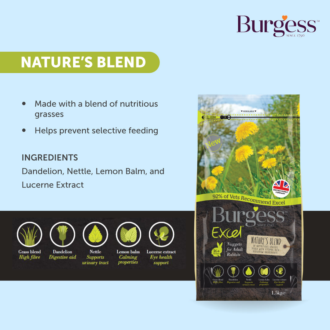 Bring your rabbit closer to their natural roots with **Burgess Excel Nature’s Blend Rabbit Nuggets** – a wholesome, hedgerow-inspired diet packed with natural ingredients and bursting with taste, texture, and nutrition.