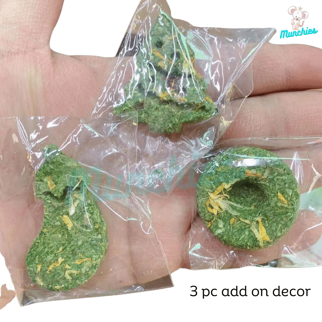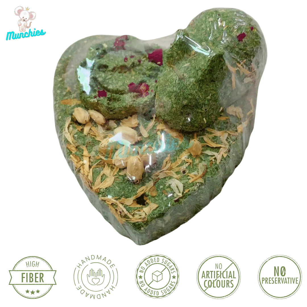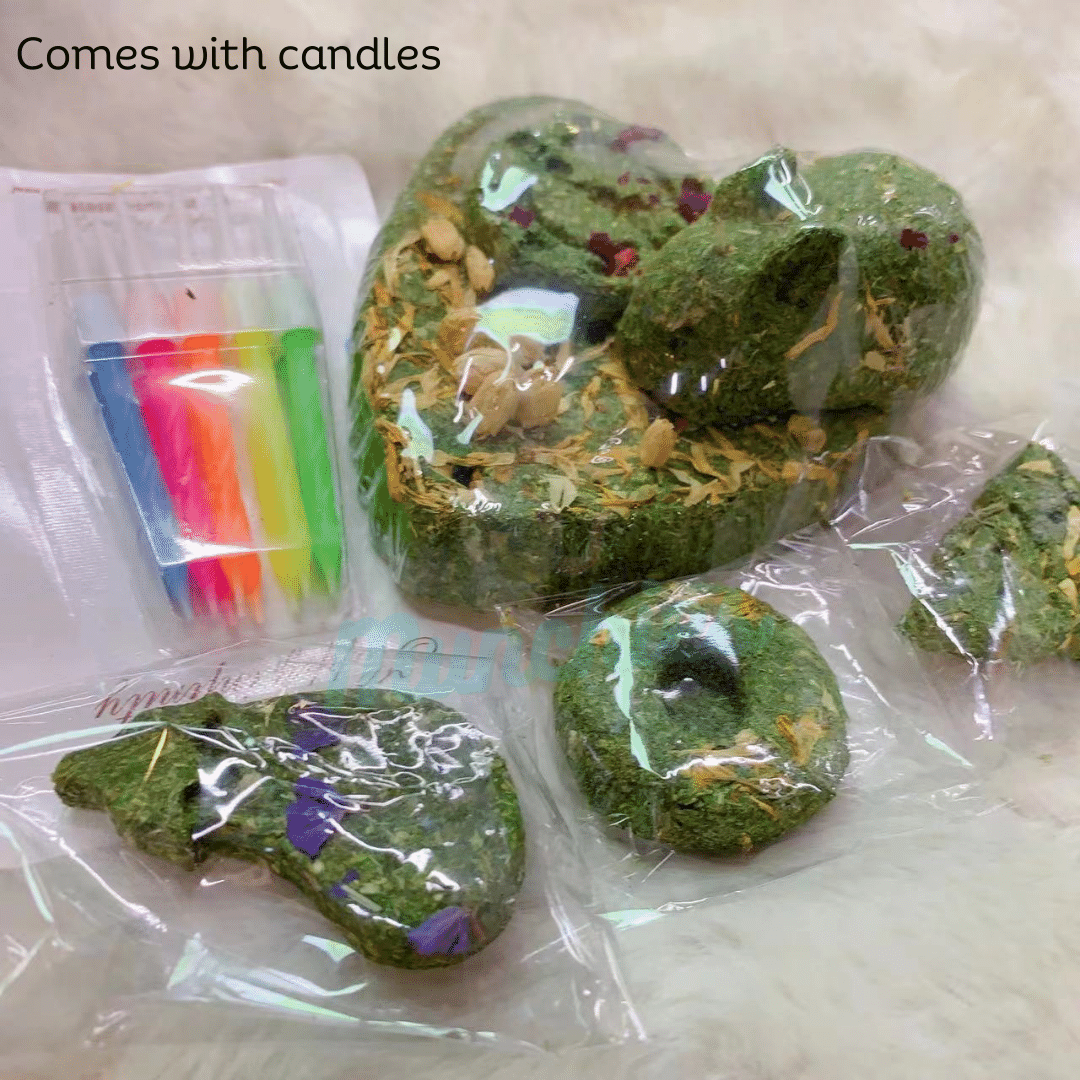 Handcrafted from premium Timothy hay and edible flowers, this birthday cake is as wholesome as it is cute. Choose from two celebration-worthy designs: the 2D round (10cm) for a timeless look, or the 3D rabbit heart (7cm) for a touch of playful charm.