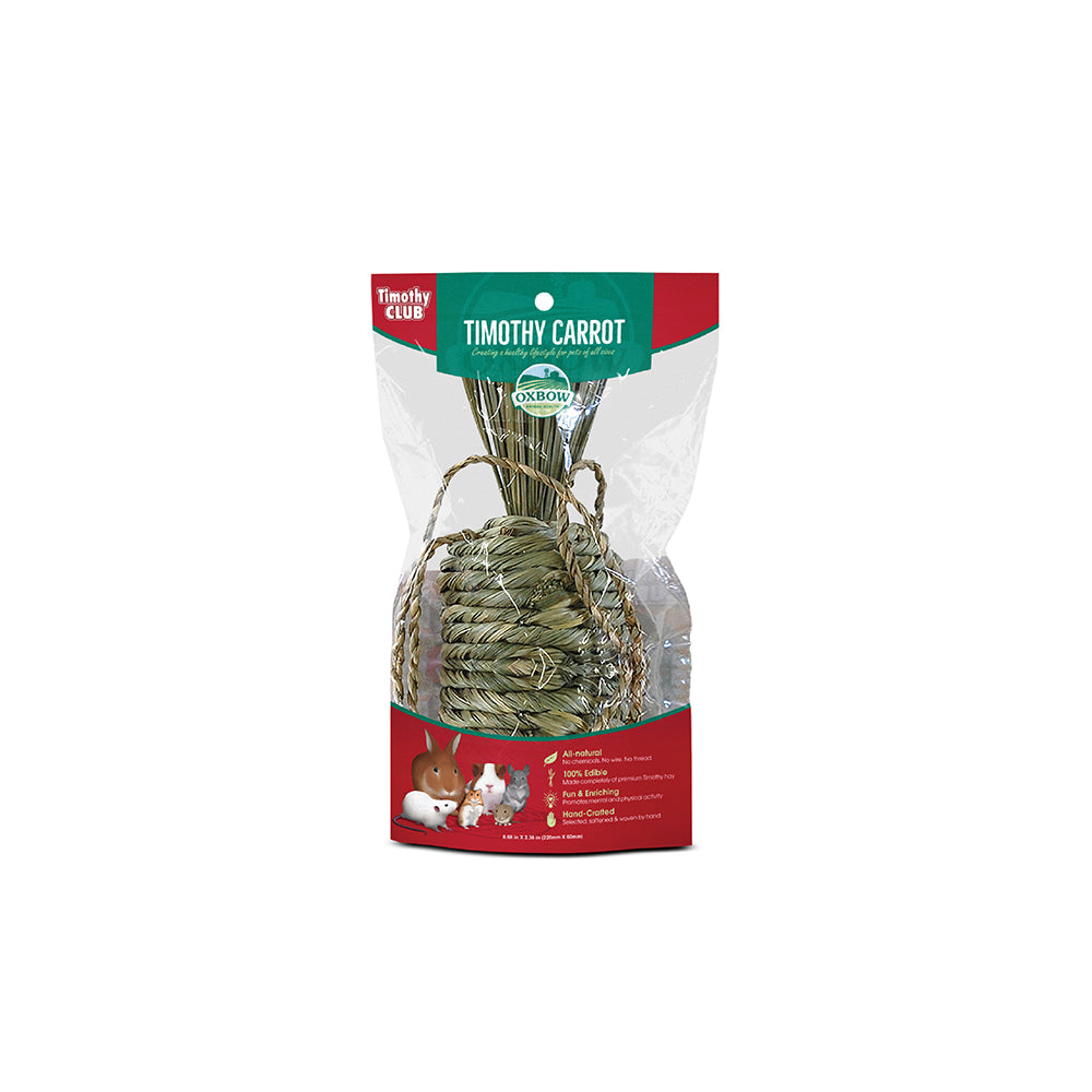 Brighten your small pet’s environment with the Oxbow Timothy Club Timothy Carrot. Hand-woven from 100% premium Timothy hay, this adorable, edible chew toy promotes healthy chewing habits while providing a fun and stimulating activity for rabbits, guinea pigs, rats, chinchillas, and other small animals. Naturally safe, naturally delicious—perfect for play and dental health.