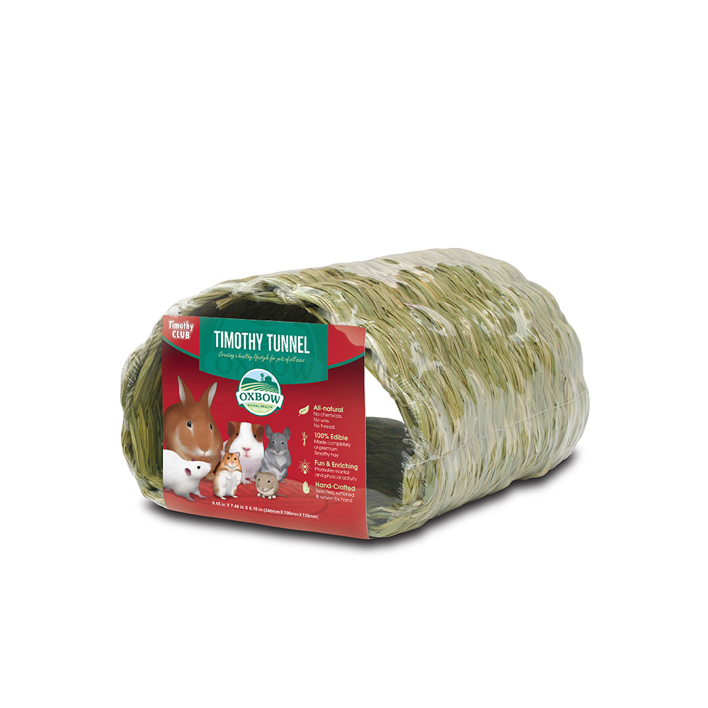 Enrich your small pet’s environment with the Oxbow Timothy Club Timothy Tunnel. Made entirely from 100% hand-woven Timothy hay, this safe, edible tunnel offers the perfect combination of comfort, entertainment, and healthy chewing for rabbits, guinea pigs, rats, chinchillas, and other small animals. Designed to satisfy natural burrowing and nesting instincts—naturally and deliciously.