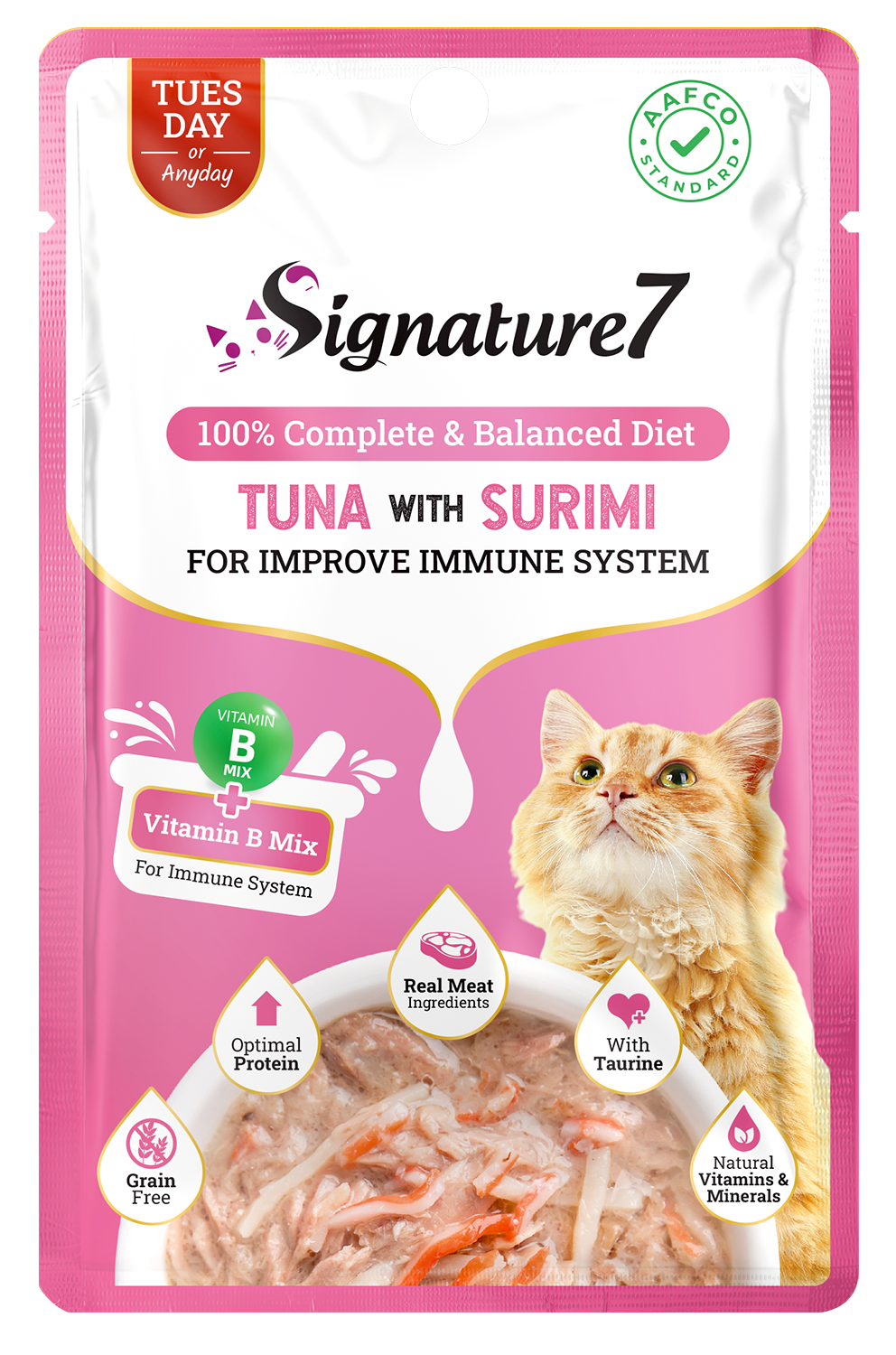Nourish your cat from the inside out with Signature7 Tuna & Surimi in Gravy – a powerful Tuesday pouch that delivers taste and immune system support in every bite.